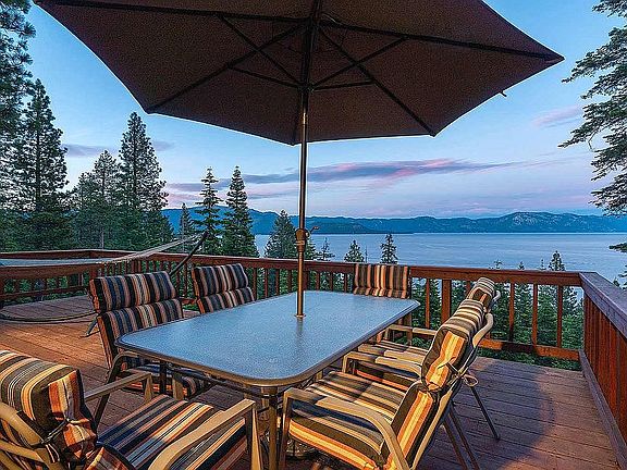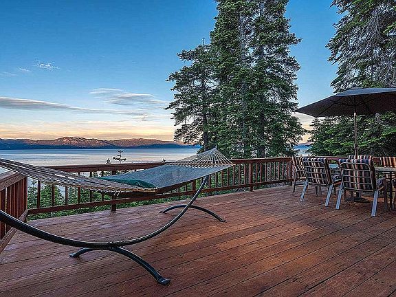 This custom home is deep-set on Old County Road, a highly prized prime lake view lot. The home was completey renovated in 2020 with hardwood floors throughout, custom interior pain, exterior stain, and so much more! This home has a beautiful pass-thru fireplace LR to Master w/ a floor-to-ceiling stone hearth, a custom-designed master bath with extra large stone shower. It also has a second master suite downstairs with dual french doors to the outside and lake views. The real "treat" is a private access to one of No Lake Tahoe's best beach and pier association w/ gated parking, 22 buoys available to only 39 households. A buoy for the Buyer is generally assured, and the HOA also provides kayaks and paddle boards.