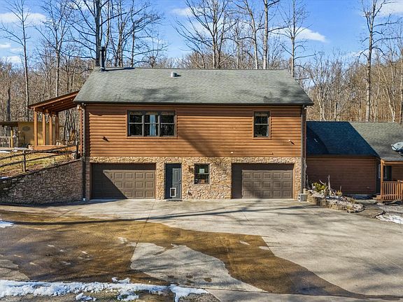 This secluded country retreat sits on 7.08 private, wooded acres, offering the perfect blend of privacy, nature, and convenience just minutes from town. The custom-built cabin-style home is in mint condition and move-in ready, featuring an open floor plan with cathedral ceilings, tongue and groove accents, and real hardwood flooring. A cozy wood-burning fireplace adds warmth and charm to the living space. The master suite is conveniently located on the main level, with an additional bedroom, a large laundry room, and ample pantry storage. The lower level features a large office space or an optional third bedroom with a private bath. Two oversized, heated garages, large enough to accommodate boats, provide exceptional storage and functionality. In addition, it has a separate living area with its own entrance, full kitchen, and bath, making it ideal for a mother-in-law suite or rental opportunity. Additional parking, RV hook-up, storage sheds, and a chicken coop. This private retreat provides a rare opportunity for those seeking tranquility and convenience just minutes from town.