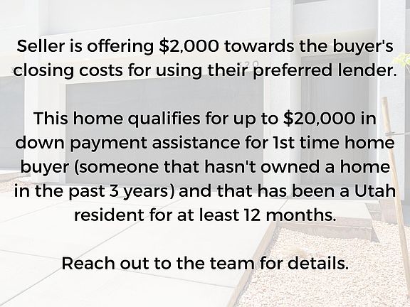 This home qualifies for up to $20k in down payment assistance for 1st time home buyer (someone that hasn't owned a home in the past 3 years) and that has been a Utah resident for at least 12 months. Seller is offering $2k towards the buyer's closing costs for using their preferred lender. Brand new, modern, 4 bedrooms, 2.5 bathrooms, beautiful cabinets, quartz countertops, stainless steel appliances including a refrigerator, nice pantry, tile backsplash, no carpet in the great room, spacious primary suite with it's own balcony that has great views, double vanities, tiled shower and walk in closet, laundry room with cabinets and washer & dryer, black plumbing & lighting fixtures, excellent location surrounded by newer homes. Don't miss out on this opportunity! *All information is deemed reliable but not guaranteed, buyer to verify all.