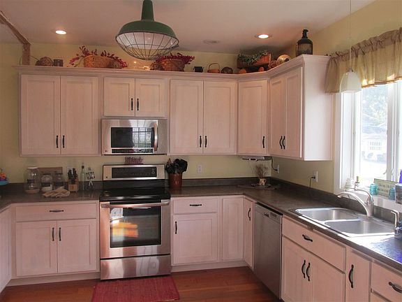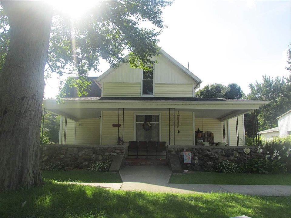 A lot of updates and tons of character in this 3 (possible 4) bedroom home. Original woodwork throughout the house. New kitchen with tons of cabinets and a breakfast bar. 2 full bathrooms, one on each level. The spacious bath on the main floor boasts a nice sized closet for extra storage. The laundry room is nestled behind a sliding barn door for extra character. The Master Bedroom has a skylight to help bring in that natural sunlight. New carpet downstairs. Stone patio out the back door for relaxing around a fire and the beautiful, covered, wrap-around field stone porch is perfect for a porch swing. There is A 30 x 40, 2 car garage and workshop with a full staircase to access the second story, ideal for a Man Cave or for extra storage. A must see.