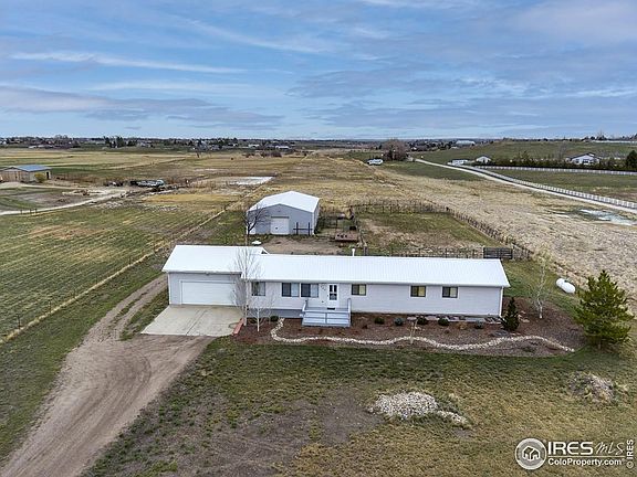 Bring your 4-H animals, horses and cars to this amazing property!! 3 bedroom, 2 bath home with a new roof on the house and garage. New flooring all throughout. A big 36'x72' insulated barn, 3 stalls and room for 3 more. 10 acres with arena and a round pen. Pasture has gates and fences. Easy back roads to commute to Carter Lake only a few miles North. Irrigation water comes with 1/4 share. New Hot Water heater. The cement foundation is bolted down. No HOA!