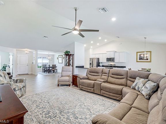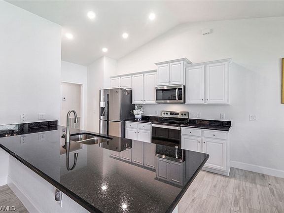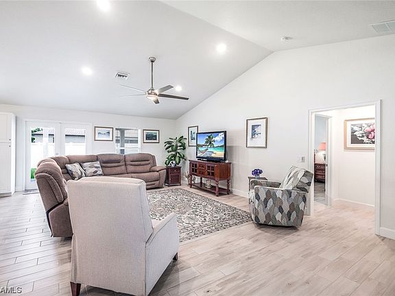 Style meets functionality in this spacious 4 Bedroom PLUS Den open floor plan. Partially fenced, triple lot homesite offers plenty of room for pool or other recreational activities. Located in one of Cape Coral's most convenient neighborhoods with easy access to dining, entertainment, shopping and Veterans Memorial Bridge. As you enter the home you are welcomed with high volume ceilings, ceramic plank tile floors, large open family room with formal dining AND Breakfast area. The kitchen features granite countertops, stainless steel appliances, and access to the spacious covered lanai. Main en-suite bathroom offers dual sinks, walk in shower and walk in closets. Well maintained and move in ready. All assessments paid! No hurricane damage or water intrusion!