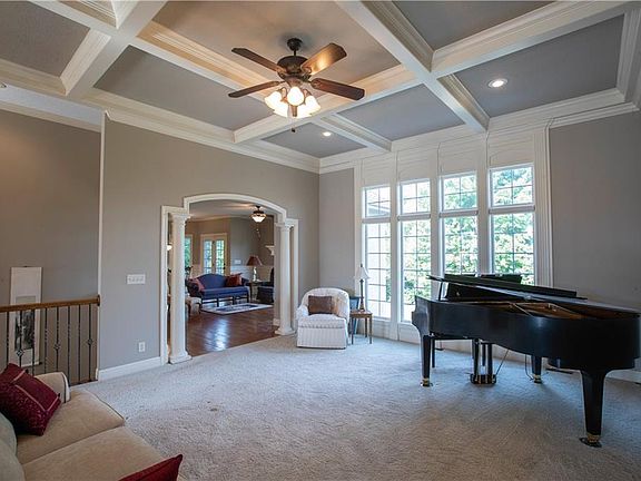 Step inside to a large living room with a boxed ceiling and a wall of windows, filling the space with natural light. The master suite is oversized, featuring a walk-in closet and luxurious bath. Hunter Douglas blinds are installed throughout the home for a custom touch.