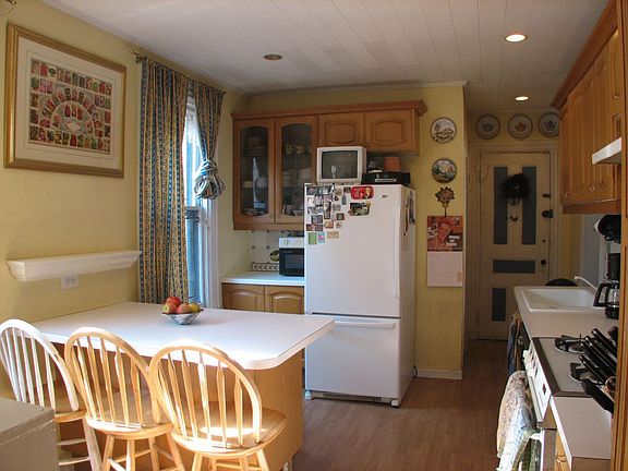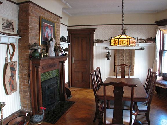 The “cute little house with a white picket fence” Old Charm with New Appeal 1st Floor: This home has an exquisitely landscaped front garden, with a cozy front porch. The living room includes original light fixtures, mantel, and another set of pocket doors that lead into a formal dining room with the original wood detail and a fireplace. Parquet floors throughout the home. Comfortable kitchen with eat in counter top and butler pantry with original built in cabinetry and a half bath. A large private yard allows you to meet all your entertaining needs. 2nd Floor: Three bedrooms with a forth adjoining room ideal for nursery or home office. Full bathroom with original claw foot tub and wainscoting. 3rd Floor: 1 full bedroom and a large open loft like space with angled walls, exposed brick and working wood burning fire place. Basement: Unfinished gas forced air heat. Exterior: Wood clapboard and cedar shingles. Special Features: * Stain glass windows * Original wood details * Large private yard
