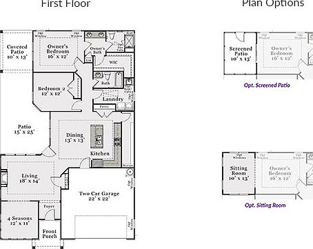 With charming cottage-style curb appeal, the Palazzo 2020 Craftsman floor plan is one of McKee Homes' most sought-after Epcon floorplans. As a single-story home, the two bedrooms, two baths, two-car garage and resort-style courtyard are easily accessible no matter where you are in the home. The open-living layout with wide interior doorways, minimal steps between indoor and outdoor spaces, immense patio and courtyard, and plenty of storage is made for entertaining or as a private retreat. As you enter, you are greeted by an expansive main living area that connects the four seasons/flex room, with plenty of windows and light, to a beautiful living room that flows directly into the state-of-the-art, contemporary kitchen and dining area. Whether you're cuddling up in front of the fireplace, watching TV, or hosting a dinner party on the chef-style island and eating bar, this open-concept layout makes for the perfect gathering spot. As you retreat to the owner's suite, enjoy private access to the back courtyard, a spa-like bath complete with beautifully tiled shower, double sink vanity and spacious walk-in closet. The Craftsman elevation features a façade that blends stone, siding and uniquely-styled rooflines to create an upscale, tailored exterior. Options include French doors opening to the four seasons room, sitting room off owner's bedroom, a walk-in L-shaped shower, deluxe kitchen and screened patio.