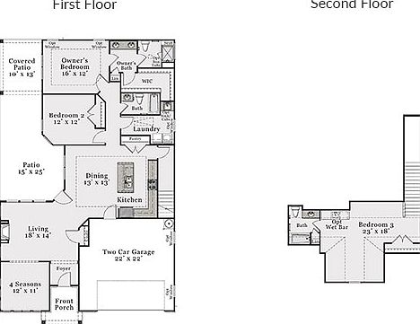 McKee Homes presents the charming cottage-style three-bedroom, three-bath Palazzo 2020 Bungalow floor plan. The Bungalow elevation includes a second-floor guest suite with full bath and roomy closet. The open-living layout with wide interior doorways, minimal steps between indoor and outdoor spaces, a large patio and courtyard, and plenty of storage is made for entertaining or as a private retreat. As you enter, you are greeted by an expansive main living area that connects the four seasons/flex room, with plenty of windows and light, to a beautiful living room that flows directly into the state-of-the-art, contemporary kitchen and dining area. Whether you're cuddling up in front of the fireplace, watching TV, or hosting a dinner party on the chef-style island and eating bar, this open-concept layout makes for the perfect gathering spot. As you retreat to the owner's suite, enjoy private access to the back courtyard with optional sliding glass doors, a spa-like bath complete with beautifully tiled shower, double sink vanity and spacious walk-in closet. the Bungalow elevation gives you the option to retreat to your upstairs sanctuary at any time. Use the second floor as a private guest suite or transform it into an entertainment area with wet bar, home gym, or anything your heart desires. Options include French doors opening to the four seasons room, sitting room off the owner's bedroom, a walk-in L-shaped shower, deluxe kitchen and screened patio.