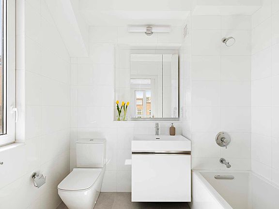 Apartment 9B is perched atop this distinguished Harlem development, a beautiful one-bedroom of about 450 sq ft. The unit has 9 foot ceilings throughout and an open plan kitchen-living room. Sunlight streams through the oversized windows displaying breathtaking northern exposures of Manhattan. The kitchen features luxurious white calacatta quartz countertops, krion backsplash and custom Italian cabinetry designed by Arclinea/B&B. The kitchen is equipped with both Bosch and Miele appliances, including a gas cooktop and integrated refrigerator/freezer. The bathroom features large format ceramic tiles by Porcelanosa, a deep-soak tub by Kohler, Grohe fixtures and custom Italian millwork designed by Arclinea/ B&B. The unit has its own washer and dryer, and the apartment sports technologically advanced windows with high acoustic and thermal performance, state-of-the-art HVAC system equipped with specialty MERV-13 air filters and individualized control. Apartment is pre-wired for cable and high-speed internet (Spectrum or Verizon FIOS). This is not a doorman building, but it does have a ButterflyMX video intercom. Located in the blossoming intersection of Manhattanville and Hamilton Heights, the building is only steps from St. Nicholas Park, at the intersection of St Nicholas Avenue and 135th Streets. Commuters will find convenience in the close distance to the B/C and 2/3 subway lines, the 135th Street bus corridor and an easy commute to both City College and Columbia University.