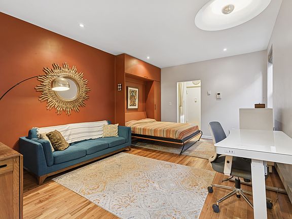 Welcome to this elegant pre-war Upper Westside Studio. The thoughtfully updated open but separate kitchen features sleek quartz countertops, an energy-efficient stainless steel refrigerator with double-drawer bottom freezer, a De'Longhi range, and ample cabinet space. The full bathroom has been meticulously renovated. Enjoy abundant natural light throughout, with the added convenience of a queen size Murphy bed and built-in storage maximizing space. This home is equipped with California-style closets, 9 foot ceilings, video intercom system, oversized windows, thru-the-wall AC unit, and original hardwood floors throughout.