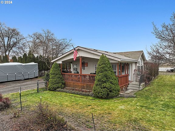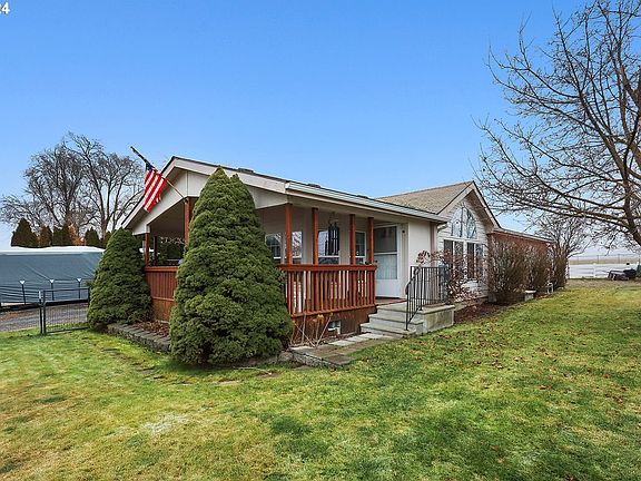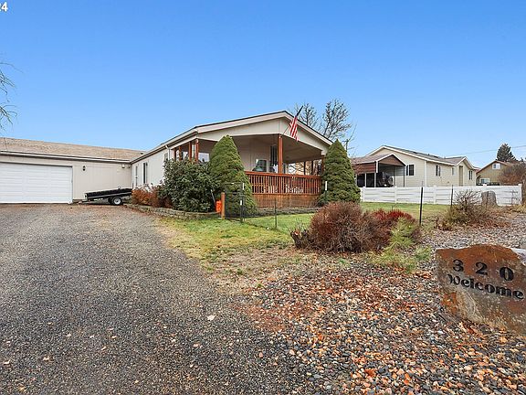 This charming home offers a perfect blend of comfort, convenience, and potential! As you walk up the steps and settle onto the covered porch, you're already greeted by a relaxing space ideal for unwinding or enjoying a BBQ all year long. Step inside and you'll find a well-maintained manufactured home designed for easy living. The vaulted ceiling in the main living room gives the space an open, airy feel, while the dining area is perfect for family meals or entertaining. The living area features a cozy pellet stove, offering warmth and ambiance during colder months. The kitchen is a chef’s dream, with upgraded appliances and a stunning 6-burner propane stove/oven that’s perfect for preparing meals. Whether you’re cooking for a crowd or just whipping up something special, this kitchen has you covered. There is a breakfast nook for your morning coffee. For extra space and flexibility, there's a private office/pantry area that could easily serve as a guest room when needed. The home also features two additional bedrooms and two full bathrooms, providing plenty of room for family or guests. Outside, the 2-car attached garage is spacious enough for both parking and a workbench area, perfect for DIY projects or extra storage. The fenced front and back yards offer privacy and security, while the sprinkler system keeps everything lush and green with minimal effort. You’ll love the garden spot, the handy shed, and the small chicken coop—ideal for anyone who wants to try their hand at a little homesteading. Everything you need is already done and ready for you to move in and enjoy—no updates required. This is a turnkey home that’s ready to become your personal retreat! Store your RV with full hookups. Call your agent today before the home is snatched up!