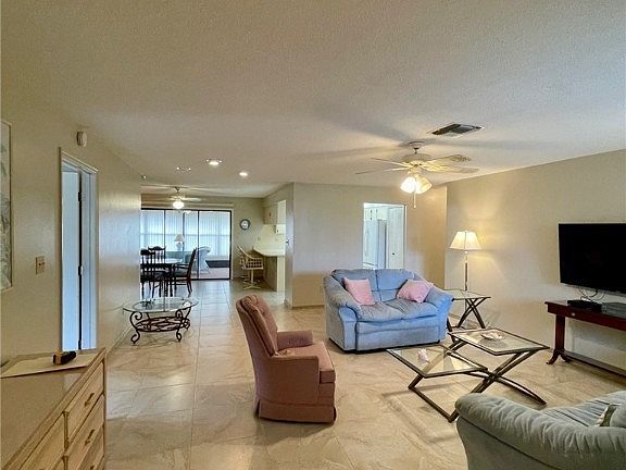 Welcome to the well-manicured retirement-style community of Lake Damon South. Located just a short scenic golf cart drive, away from Rivergreens Golf Course on the north side of Lake Damon. Community Club House and Heated Large Pool. Won't you be My Neighbor? My wife and I live just down the street and have enjoyed this Community for 23 years. I am pleased to have this 2-bedroom, split plan, 2 bath, 2 car garage home with 16 ft. x 10 ft all-weather porch available for your consideration. Seller had a new architectural shingle roof installed in Sept. 2024. Newer 20-inch tile has been installed in the entire home, very attractive neutral color. Home appears to be well maintained, ready for a new owner's personal touch. The floor plan flows well and gives the feeling of 2 master suites. Kitchen has 2 pantries. Lots of extra closet space is incorporated into this home. Call your favorite Realtor and come experience this home today.