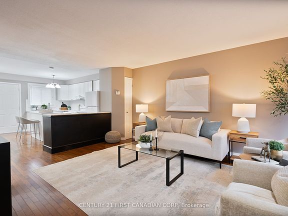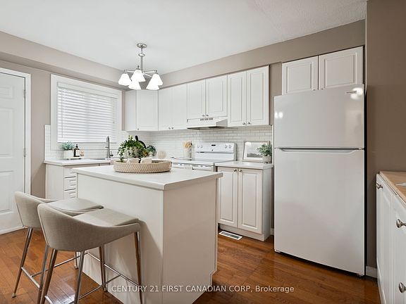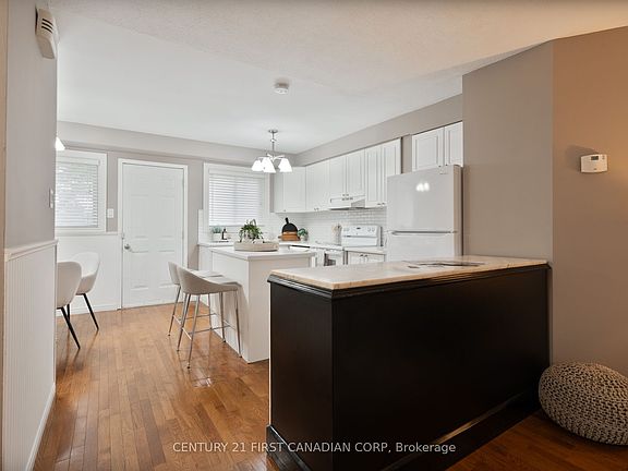 Come enjoy this SHARP and well maintained FULL-SIZED Townhome. Hardwoods throughout a spacious and dynamic living area open to a sprawling updated white on white kitchen with subway tile splash and center island PLUS additional marble topped peninsula for TONS of counterspace. Leading out from your eating/dining area, is a southern exposed 12' x 10' raised sundeck, overlooking GREENSPACE. Main level replete with UPDATED 2 Piece Bath, while upper level has another FULLY UPDATED 4 Piece Bath also. Boasts an ENORMOUS primary suite with double closet. Other 2 bedrooms offer ample room and lots of sunlight! Lower level remains versatile for all your needs as family room or another potential bedroom and bath, but currently an excellent exercise area and laundry with LOADS OF STORAGE. Main and upper Windows ALL REPLACED 2024, offers High Efficient Forced Air Furnace and Central Air. Very close to your private parking (additional parking available) and only steps away from Victoria Hospital, The walk paths of MILL PONDS, playparks, groceries and all amenities. Easy access in and out of town! THIS PLACE IS A MUST SEE! Book your private appointment now!!