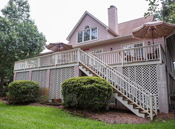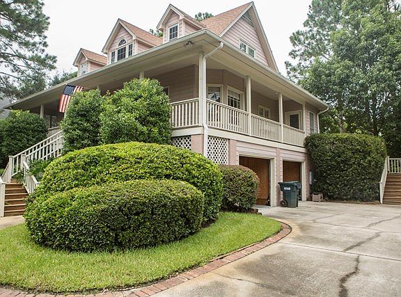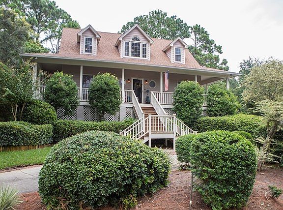 Beautiful, well-maintained low-country style home with lush landscaping, circular drive and rocking chair/wraparound front porch. Two-story great room with fireplace and custom built-ins, spacious dining room and well-appointed, eat-in kitchen. Expansive deck runs length of house. Three bedrooms, 2.5 baths. Generous-sized master on main floor with hardwoods and french doors opening to deck. Master bath has double vanity, whirlpool tub, separate shower and large walk-in closet. Two guest bedrooms upstairs share one full bath with double vanity. Both guest rooms have 2 closets and entrances to storage/attic areas. Quality features throughout. Garage level has 2 car parking equipped with a shop vac. Plenty of storage and a Man Cave! Irrigation system/private well. Plenty of guest parking.