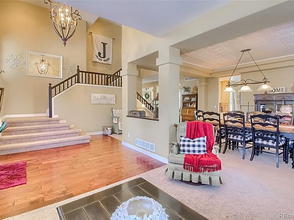 This home is located in the much sought after Indigo Hills area of Highlands Ranch. It sits on a large corner lot with no neighbor on one side, established landscaping for privacy, stamped concrete patio and backing to a greenbelt with a walking path. The home features 6 bedrooms, 4 on one level, and 5 bathrooms. As you enter the two story foyer, you will see the unique split staircase design. The formal living area is a comfy space and open to the formal dining area, perfect for entertaining. The dining room has a painted tin ceiling and butler's pantry on the way into the kitchen. The eat-in kitchen features a large center island with a newer gas cooktop and pot rack light, stainless appliances including a double oven, granite counter tops and distressed cabinetry. The great room has a two story ceiling, gas log fireplace and a view of the catwalk upstairs. Plentiful windows bring in lots of natural light. Also on the main level there is a study with glass French doors and next to a full bath in case you need a 7th bedroom. The laundry room has ample cabinetry and a utility sink. Upstairs the sunny master suite is expansive with an oversized walk in closet. The 5-piece bath has a corner soaking tub, glass shower enclosure, glass bowl double sinks set on granite and newer flooring. two secondary bedrooms share a full Jack n Jill bathroom. The 4th bedroom has it's own full bath with updated counter top and flooring. Downstairs there are two more sizable bedrooms, one which used to be a theater room. The family/recreation room area can accommodate media space along with a pool table and so much more. There is a newer 3/4 bath with slate and a rain glass shower enclosure. The utility room has two furnaces and two hot water heaters. There are some newer windows and a new roof. A 3 car garage for all of your toys! The seller is offering a flooring allowance so ask for details.
