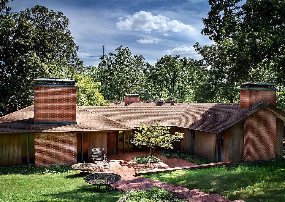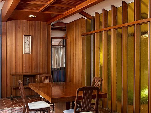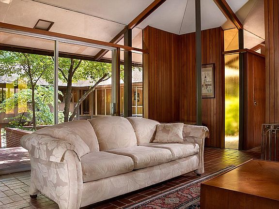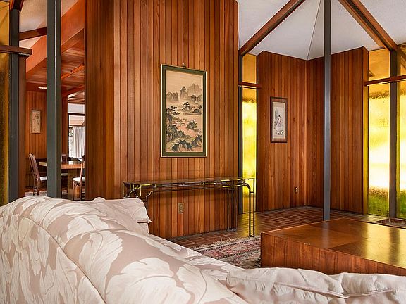 This from the architect: "your house is very much an example of Mid-20th Century Modern Architecture. Its design is a product of my early work with Craig Ellwood there in Los Angeles and later with Edward Durell Stone in New York, Palo Alto, Beirut, etc., etc." "I do consider your father's house to be one of my best projects during a long career, and its builder was the very best I ever encountered. [The first owner] Oscar Chambers spared no expense, so the house is indeed unique, at least in material and equipment." "In my mind, the house is of unusual quality if only because of its walnut interior woodwork -- unheard of or impossible today -- and the restaurant-quality kitchen equipment, Jacuzzi bath, four fireplaces, library, etc., etc." "Other amenities which you may wish to emphasize: brick floors, large central terrace with upper and lower levels, small breakfast terrace off the kitchen (formerly screened by heavy planting -- missing in the photographs?), long children's balcony, 2-storey playhouse, large "rumpus" room with much storage, walnut study cabinetry in children's bedrooms, etc."