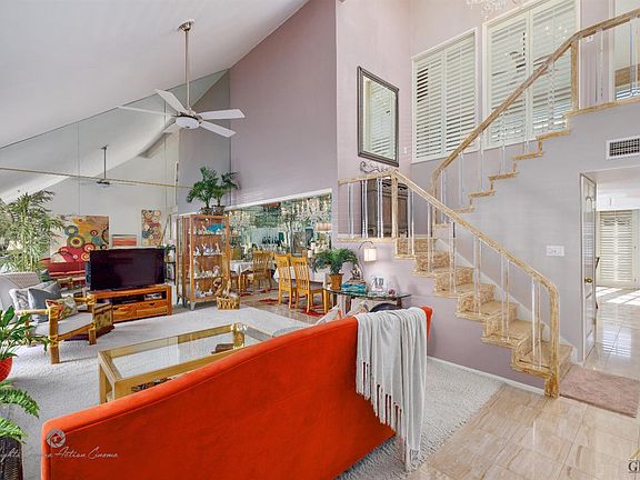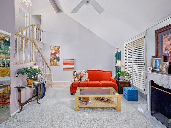 Riviera Westchester condo totally upgraded inside & out. Two Master suites, 1 up and 1 downstairs, 3rd bedroom currently a sewing/extra closet space, easily turned back to a bedroom. Freshly painted inside & out within the last year. Formal living room w/dramatic vaulted ceiling, fireplace w/marble & mirror surround, opening in to formal dining room w/extensive use of mirror & a crystal chandelier. Total kitchen remodel in 2019--cabinetry, Quartz counters, under cabinet lighting, black stainless Frigidaire appliances, walk in Butler's pantry w/additional storage. N/S facing, lots of window & custom shutters. Downstairs has marble flooring & white shag carpet, faux finish staircase w/clear acrylic railings & crystal chandelier. Master suite upstairs w/walk in closet, fresh paint, carpet, windows & shutters. Oversized 2 car garage w/opener. Complex has a gated park like setting & sparkling pool.