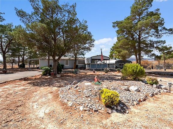 This is a fantastic opportunity to live on a 1-acre lot, zoned RE-1, with stunning views of Mount Charleston. The property at 3200 Florenza features a manufactured home that has been converted to real property and offers 2 bedrooms plus an additional den, which can be used as a potential third bedroom or hobby room. The owner's suite includes dual sinks, a tub, and a separate shower. The open living room flows into a formal dining area, with additional dining space in the kitchen.