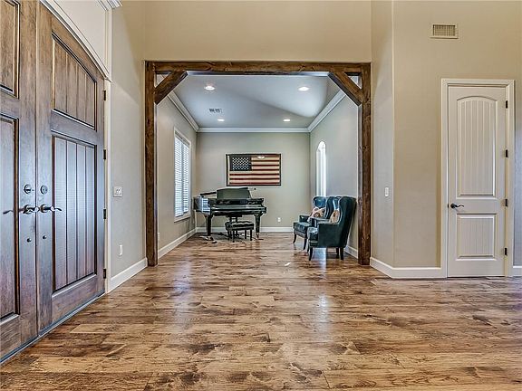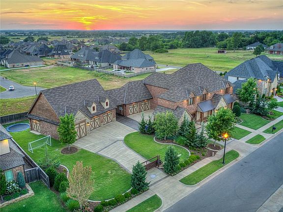 Incredible home situated on a double lot with some of the best views of the Oklahoma Western sky! Amazing 6 car garage finished out for extra living space and clean storage. Stunning resort style backyard featuring a pool, fire pit area, bar with built in grill and plenty of covered patio space. Over 4500 SF of living space inside to include 5 generous bedrooms, 5 bathrooms, theatre room, wet bar, study and more. Post tension foundation, foam insulation, {3} units 95% high efficiency, generator back-up for entire home, abundant storage, custom paint and stain finishes, hand scraped hickory floors, upgraded granite, oversized bedrooms and bathrooms, custom cabinetry, in master laundry. This home has absolutely everything!
