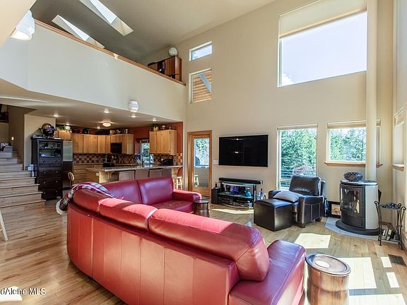 PENDING at the time of listing...Architectural Beauty in the Trees just 10 minutes to downtown Coeur d'Alene. This unique home on a 1/2 acre is close to the marina and boat launches. Enter into a spacious, airy and sun filled great room open to the dining and kitchen with access to the outdoor decks. The 2nd floor offers over 1200 sq ft dedicated solely to the oversized primary suite and office/loft where you have spectacular views of trees and the lake. Gorgeous decks and brick patios offer lots of outdoor entertaining.