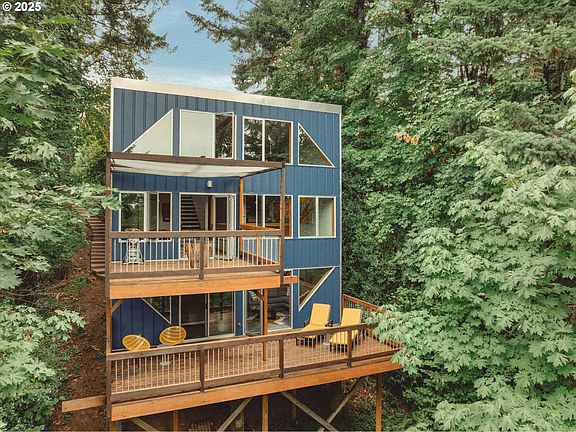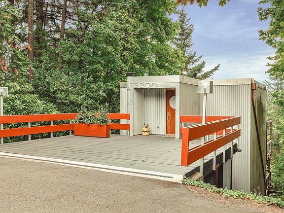 Tucked into the lush hills of Council Crest, this 1976 NW Contemporary seems to hover among the trees, its sleek color steel exterior recalling the form of a vintage camera, poised to frame every season. Featured on the March 1977 cover of Sunset: The Magazine of Western Living, the home was celebrated for its innovative three-level design, conceived by architect Willard Martin as a 24-ft cube composed of modular 12x12-foot spaces. Clad in corrugated metal and punctuated by distinctive bubble windows, it was praised as a functional, light-filled solution for the West Hills site, a proof point that small can indeed be more, “a way to make a cube not feel like a box.” From the moment you step inside, glass walls draw your eyes outward to the shifting light and forest beyond, while parquet floors add warmth underfoot.The home unfolds like a vertical journey. At the top, a flexible office or studio shares space with a guest-ready bedroom suite, complete with a Murphy bed, creating a quiet perch that looks down over the levels below. The middle floor is where gatherings happen, with an open kitchen and dining area spilling onto a deck where sunsets set the canopy aglow.Downstairs, the mood softens. The primary suite opens to a secluded deck, with the air carrying the scent of evergreens. Inside, a stunning feature fireplace anchors the family room, while the spa-like bathroom offers radiant heat beneath your feet, even in the shower, and custom tandem sinks imported from Greece, a touch of artistry for everyday rituals.With 2 beds, 2 baths, and spaces that adapt to work, rest, or play, this 1,762 sq ft home lives far larger than its footprint. Set on nearly a 1/4 acre, it offers the quiet of the treetops with Hillsdale’s markets, Council Crest Park’s trails, and downtown Portland just minutes away. Equal parts architecture, art, and nature. [Home Energy Score = 1. HES Report at https://rpt.greenbuildingregistry.com/hes/OR10241208]