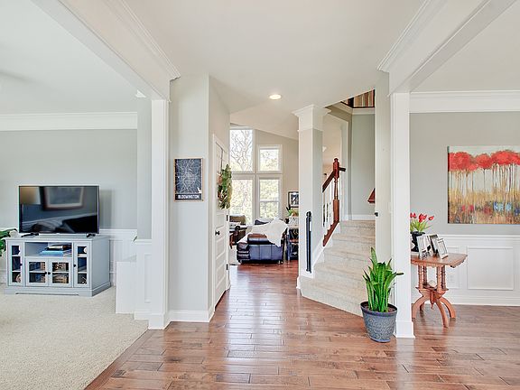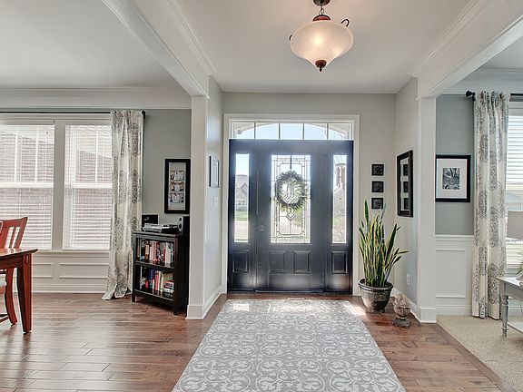 Welcome to your Fischer built gem in the Reserve at Somerset featuring hardwoods & 9 ft. ceilings flowing throughout main. Grand 2-story foyer & living room boasts soaring window wall, filling home with natural light. Cozy up by the fireplace on chilly nights bringing warmth & ambiance inside. Tiled bathrooms, walk in closets, den + dining room crown molding & wainscoting adds a touch of luxury. Primary Suite features builder's Deluxe Bath upgrade. Excellent for entertaining, exterior features 16x12 patio & offers tree line privacy. Lot is positioned on cul-de-sac. HOA covers community pool, playground, & tennis courts. Fantastic Bargersville opportunity in highly desired Center Grove Schools. Truly a perfect blend of elegance & comfort!