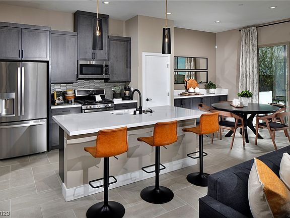 Stunning modern brand new former model 2 story townhome in desirable Inspirada. This townhome has amazing features throughout. The spacious kitchen boasts a beautiful white island and countertops, with dark cabinets and custom backsplash. The liviving room is just off the kitchen and overlooks the stunning landscaped backyard. Upstairs boasts the laundry room, primary and two secondary bedrooms. The primary bedroom is very spacious with en suite bath boasting double sinks, and large shower.