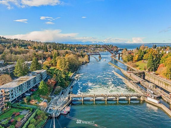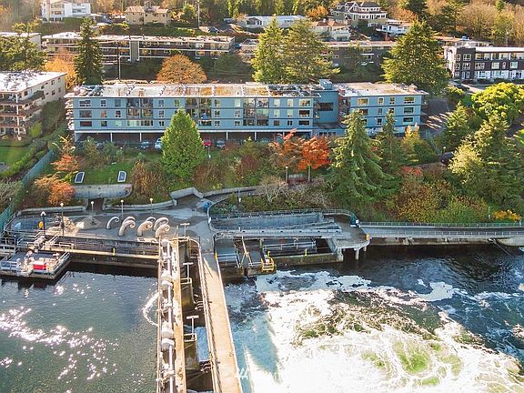 View, View, View of the Ballard Locks/Salmon Bay and passing ships from this beautiful condominium, rare resale in the popular Lockshore Condominiums adjacent to Commodore Park, just above the fish ladder & wave sculpture, many recent updates including: interior paint, front door, elec. panel, water htr, light fixtures, & most kitchen appliances, nice sized balcony, large living rm, formal dining rm with great views, french doors to the bedroom, updated bathroom w/ custom bath tile, level access, 1 good sized parking, newer elevator, laundry rm, outdoor pool, sauna, storage locker, bike rm, party space, pets allowed, no rental cap, and all within walking distance of central Ballard. This condo would be a great place to call HOME!!!
