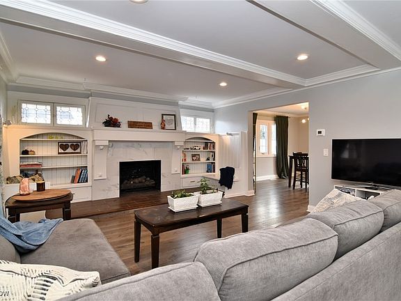 - Features: Beamed Ceilings, Bookcases, Built-in Features, Fireplace