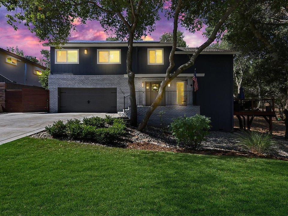 This fully renovated, upscale rustic/modern 2224SF home with farmhouse flair awaits you. Nestled in a grove of oak trees, you will enjoy this peaceful .31acre location with over 300sf of decking off the oversized living room. The living room is perfect for relaxing with its cathedral ceiling, 2 sets of fully opening french doors, floor-to-ceiling fireplace, custom modern staircase along with beautiful views from the 2-story picture windows. The open kitchen features soft close white cabinets, stainless Kitchenaid appliances, marble counters and separate dining area. Fully renovated baths with marble vanities, grey oak laminate flooring, farm style lighting, neutral painted interior, stamped concrete drive with extended parking for 5 or more vehicles, and dual AC units. Upstairs is a loft/office area, 4 bedrooms and 2 full baths including the updated master with ensuite. The downstairs office/den with 1/2 bath and a walk-in closet could be used as a 5th bedroom. Additional features include custom built farmhouse doors, custom workstation in upstairs loft, cost-saving V3 Solar, and room for RV access. Large, concreted storage room under the home. Beautifully landscaped with sprinkler system and a short walking distance to Cameron Park Lake. An impressive, must-see home!