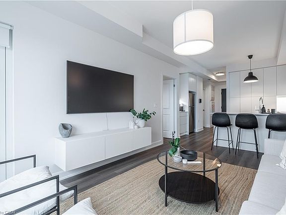 Unlock turn-key living at the Upper West Side Condos by Branthaven! This beautifully maintained 695 sq ft one-bedroom + den, one-bathroom suite on the fourth floor is truly one of a kind. Step inside to wide-plank flooring throughout, bright white walls in flawless condition, and a stunning kitchen featuring quartz countertops, subway tile backsplash, under-cabinet lighting, undermount sink, floor-to-ceiling cabinetry, seating for three at the peninsula, a dedicated coffee bar, and a fridge water line hook-up. The spacious living room boasts soaring ceilings, a builder-upgraded TV-ready package, and access to a private 50 sq ft south-facing balcony with serene views. The bedroom easily accommodates a queen bed with room to size up and offers an expansive closet with room for a dresser, plus a valued builder upgrade: ensuite access to the four-piece bathroom, complete with a large vanity, ample counter space, and pristine tilework. Additional highlights include in-suite laundry, an entry closet, geo-thermal heating and cooling, one storage locker, one underground parking space, and Bell internet included in the condo fees. Enjoy the convenience of keyless entry and the BH Home Technology system for a seamless living experience. Residents have access to top-tier amenities, including a concierge and security, fully equipped gym, pet wash and grooming station, media and party rooms, games rooms, rooftop deck and garden with BBQs, and ample visitor parking. Located in the heart of Joshua Meadows, you’re just a short drive to the Uptown Core for shopping, dining, and services, as well as nearby walking trails, golf, parks, and top-ranked schools. Commuting is effortless with quick access to highways 403, 407, and the QEW, making both work and play incredibly convenient.