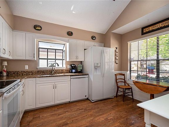 Beautifully updated, WITH A DEN and MOVE IN READY! You'll love everything about this home! Great curb appeal-meticulously manicured lawn & charming front garden. Step inside to a kitchen with WOW factor-remodeled in 2013/4 (value $10K), this bright & cheery space boasts granite counters, plenty of cabinet space (w/soft close cabinets) & eat-in nook overlooking the garden. All appliances included! Walk back to the huge and versatile great room w/vaulted ceiling & fireplace. The wood laminate flooring (new in 2012) extends to the den and master bedroom. Double set of sliding doors w/built-in blinds helps keep the space bright. Den off great room - ideal as an office and could easily be converted into an additional bedroom. Master suite includes ensuite bath, walk-in closet and direct access to back yard. Both baths updated in 2016/7. Stunning master bath includes 2 granite topped vanities and shower w/attractive tilework and bench seat. Another reason to love this home is the outdoor entertainment spot-lanai. Uniquely situated on the side of the home, this attractive space boasts tile flooring and ceiling fan, and leads to a paver stone patio. You'll also enjoy a sizable, fenced backyard. Other notable features: (1) A/C new in 2014 and (2) Roof (installed 2004) has a 30 year warranty. Great location-well established community of nicely maintained homes, community pool & tennis, short drive to essential shopping/dining and major roadways. Come see all that this special home has to offer!