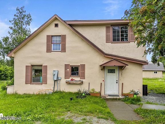 This vintage original Palmer Colony home sits on over an acre and has been remodeled with beautiful cabinetry, windows, appliances, Electrical service panel and wiring along with new natural gas furnace and water heater. Price point reflects remaining repairs and upgrades that need to be completed by a new owner. Sale includes equal ownership of the entire airpark, including strip and roads!