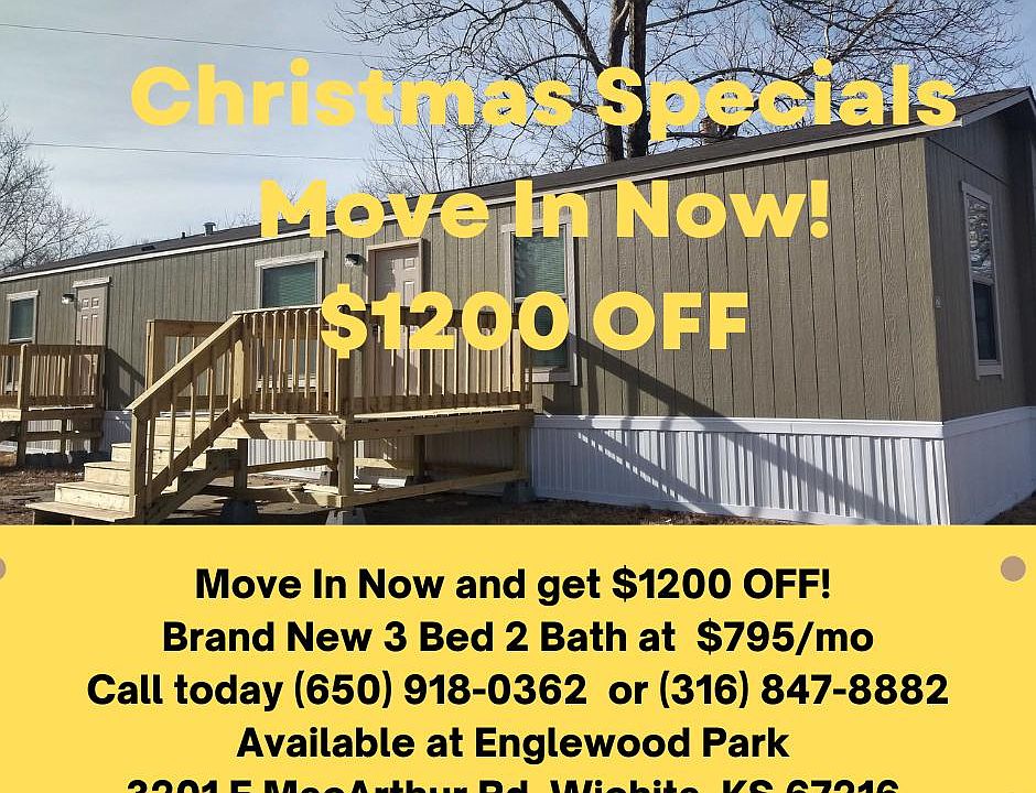 Now is the time to move-in! Ready yourself with our Christmas specials! Low Move in cost! Call now! Our BRAND NEW 3-bedroom home is waiting for you at only 795/mo including lot and home rent. This home has everything you need! it comes with fridge, stove, central AC, washer and dryer hookups ,and many more! Calls us now and get $1200 off your rent! Located at Englewood Community Small pets OK 4 mins away- Spirit Aerosystems 2mins away- Local restaurants 2mins away -Oakview Christian Church 4 mins away- Elementary and Highschools including Derby Schools 2 mins away - Kansas Cliff Club 11 mins away- 135 13 mins away- McConnell AFB 18 mins away- SutherlandsMins 12 -15mins away-Wichita Tourist Attraction Address: 3201 E MacArthur Rd, Wichita, KS 67216 Monday-Friday 10am -5pm Saturday 10am -2pm