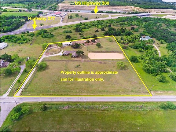 Ideal location for future commercial-1 development. Great 5.011 acres located near 380 & 377 intersection in the fast growing Cross Roads 380 Corridor. Presently zoned residential with a lovely 3 bedroom, 3 bath, 2 car garage brick ranch style home on the property. The home was built in 1996 and is approximately 2005 sq. ft. Home would be suitable as a rental property while waiting for development. Currently the property is being used for horses and has a very nice horse barn.