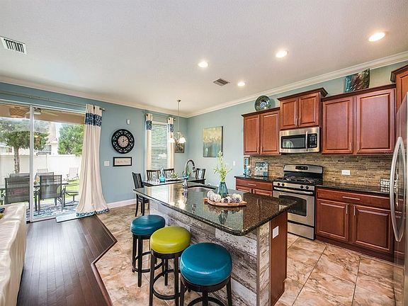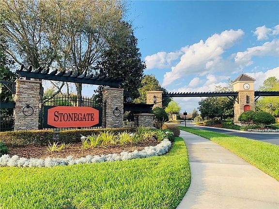 Rare opportunity in the GORGEOUS GATED COMMUNITY OF STONEGATE! Nestled under the palm trees, this home is perfectly placed on a quiet loop! Step into your grand foyer spilling effortlessly into family spaces! But before you enjoy the gathering area you'll see a NICELY SIZED DEN with double doors for privacy. Then onto more of this fabulous Southern Crafted Saint Andrews Model and all it has to offer! Rich engineered hardwood floors are enjoyed in the family room while this open floor plan also boasts dining and kitchen too! A busy family will agree this is definitely the "heart of the home"! Stunning STAGGERED KITCHEN CABINETS with CROWN MOLDING & BRUSHED NICKEL HARDWARE are complimented by CUSTOM BACKSPLASH TOO! CENTER ISLAND, UPGRADED GAS STOVE, HUGE WALK-IN PANTRY continue to add value to this amazing family home! A DOWNSTAIRS GUEST SUITE, full bath and utility room are conveniently located too! Upstairs is enjoyed by all with generous BONUS ROOM, perfect for football watching & sleepovers! THE MASTER BEDROOM WILL NOT DISAPPOINT! One of the largest owner's retreats and resort style bath is sure to offer serenity after a long day, complete with double sinks, garden tub & separate shower. Additional guest rooms and shared bath complete your upstairs. Granite counters, custom window treatments & blind package throughout as well as 5 1/4" baseboards, water softener & spacious backyard make this home a must see!