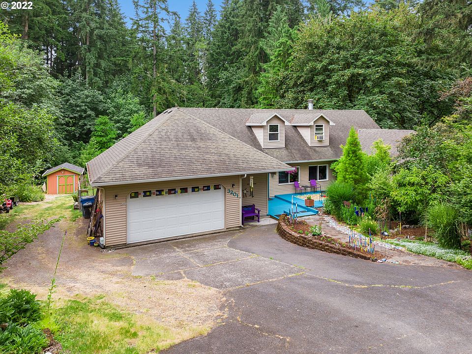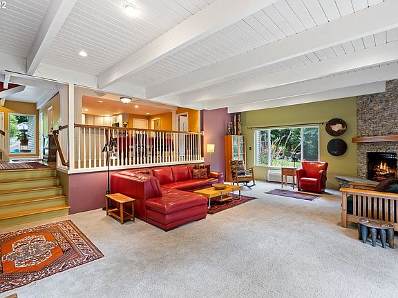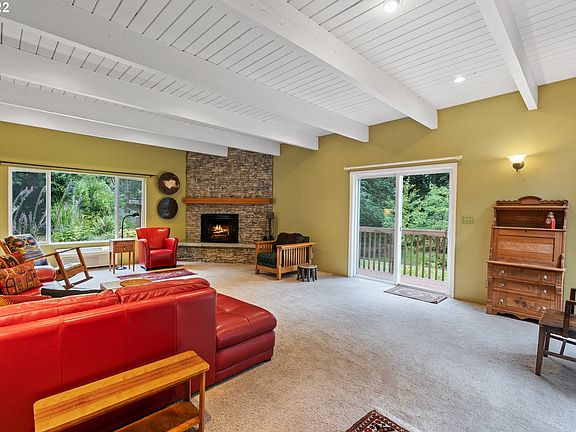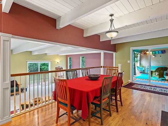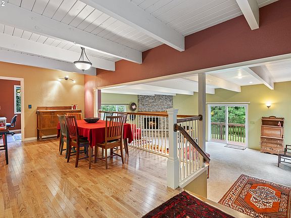 Enjoy this tranquil, wooded retreat on private, close-in, terraced 1 acre parcel. Classic open-beam ceilings throughout, custom paint & wood floors. Cozy living & family rooms both have wood fireplaces to keep you toasty warm. 5 sliders access 16x10 covered & 22x16 decks. Primary suite has dual sinks, shower, soaking tub & walk-in closet. Kitchen has eat-in bar & pantry. Huge upstairs bonus room/loft w/ skylights, windows & massive storage area. Garage has workshop. 2 water heaters.