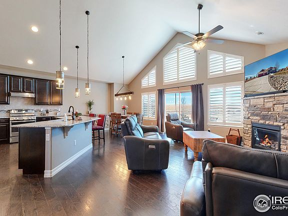 Welcome to 3201 Timeless Cir in the desirable Serenity Ridge Subdivision in Berthoud. This beautiful home boasts tall ceilings and incredible views of the Rocky Mountains as you step through the front door. The main level has a great open concept layout for the living, dining, and kitchen with views of the west to watch the gorgeous Colorado sunsets. The kitchen offers tons of storage, granite counters and high end appliances. The primary bedroom can be found on the main floor with tons of natural light and views of the mountains. A large en-suite bathroom and walk in closet has direct access to the laundry room! Come downstairs to see the incredible entertainment area. You will find a beautiful built in bar, custom made shuffle board, air hockey table, foosball, pinball machine and dart board. You will only be tempted to leave the basement fun for the backyard oasis that has a stunning saltwater pool with two pergolas with a tiki bar all surrounded by beautiful landscaping. What's even better you are only minutes outside of downtown Berthoud and have easy I-25 access. You won't want to miss this one!