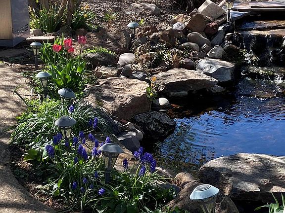 The landscaped front and back yards, featuring a pond and mature trees, require minimal maintenance. Enjoy a winter wonderland with a pond cascade of ice. The backyard oasis includes grapevines, a producing blackberry bush, and seasonal perennials.