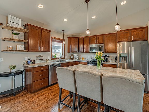 Located in NE Bismarck, you'll find this well-maintained home with 4 bedrooms, 3 bathrooms, and a 3 stall garage. This open and spacious home has beautiful natural light throughout. The main floor features vaulted ceilings and a large primary bedroom with a walk-in closet and ensuite bathroom. From the sliding doors in the kitchen, you'll walk to the large deck and gazebo, part of which is covered and screened. The main floor also has a guest bathroom and a large second bedroom. Down the stairs, you'll find a large family room with a gas fireplace. There are two additional bedrooms, a bathroom, and a mechanical room with laundry downstairs. The heated three-stall garage has water hookups and a floor drain. The driveway offers a parking pad beside the garage -- perfect for extra toys. This home is close to golf courses, recreation paths, and Legacy High School. Call your favorite agent to see this home today!