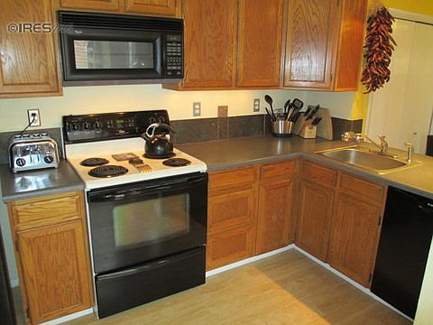 Wonderful sunny, main level condo updated with new paint, wood laminate floors, wood blinds & wood burning stove to give you the feel of Colorado. The open kitchen features a pantry, newer appliances, both an eat-in area & attached dining room. Washer/dryer. Spacious master bedroom w/bay window, walk-in closet, Jack-n-Jill bathroom. Large fenced patio is perfect for entertaining. Dogs allowed. Enjoy the hiking trails & open space & being near the bus line w/Eco pass. Award-winning schools.