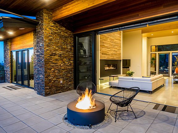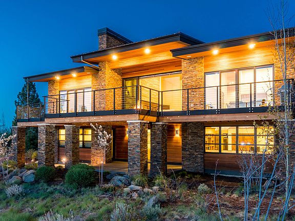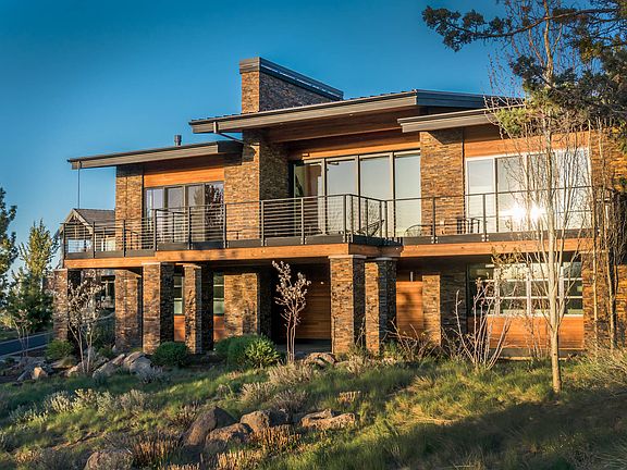Stunning Awbrey Butte contemporary home w/CASCADE VIEWS. Great room w/modern FP, sliding glass wall opens to deck w/gas fire pit. Kitchen w/Caesarstone, custom cabinets, Wolf oven, Dacor 6 burner stove, dual sinks & raised eating bar. Dining area w/wine bar. Master suite on main, FP, jetted tub & steam shower. Downstairs w/2nd master, office w/built-ins, media room w/wet bar, fitness room. Energy efficient w/radiant heat, AC, filtered water system. Covered patio and Xeriscape landscaping. 3 car garage.