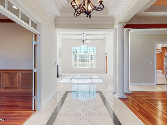 Welcome to this stunning, walk-out ranch style home on 2 acres, next to Nevel Meade golf course. This property has it all! The wrap-around driveway leads into a large foyer with marble floors and an open floor plan. The custom chef's kitchen has maple cabinets with granite countertops, industrial sized GE Monogram refrigerator and freezer, and an extra-large gas cooktop. A large family room with coffered ceilings is situated right off the kitchen, making it the perfect spot to gather. Enjoy your privacy in the massive primary suite, which includes a sitting area with French doors leading out to a large patio. The primary bathroom boasts dual vanities, a giant shower with multiple showerheads, a large soaking tub with jets, and a huge walk-in closet. (cont'd)