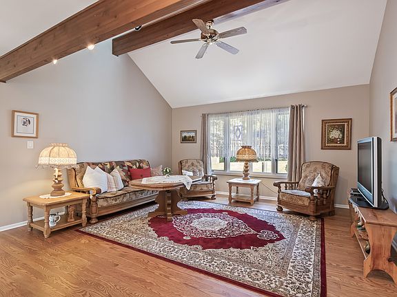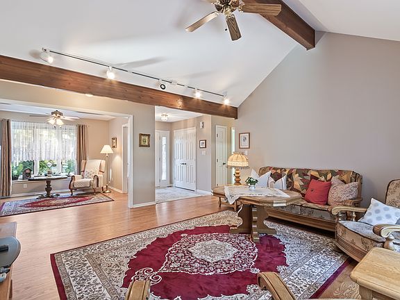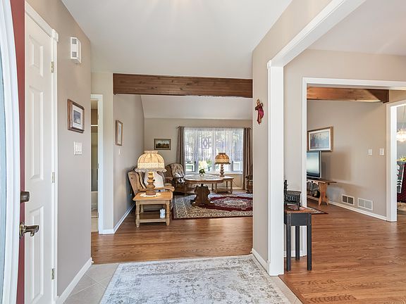 This ranch is a treasure that is extremely hard to come by. The darling front porch invites you into the foyer and once inside, you will want to make this your own special home. The cathedral, beamed ceiling of the living room adds a lofty feel as your views are drawn to the mature landscape through the large windows. A formal dining room is nestled into the front of the home, yet is open to the grand Living Room. The kitchen is extremely spacious and well laid out with varying height raised panel cabinetry, a breakfast bar and a full wall buffet serving area with custom glass front cabinetry. The kitchen is bright and inviting and open to the Family Room which also boasts a voluminous cathedral ceiling accented with a custom beam. This is a great layout for large family get togethers, entertaining or cozy gatherings. The new 8' Andersen sliding door opens into the phenomenal 3-season room with cathedral ceiling, ceiling fan and two access points to the wrap-around composite deck. This room is the perfect spot to extend your entertaining, curl up with a book, dine in style or relax with your coffee and enjoy the sounds of nature in the private and professionally landscaped fenced backyard. The upscale deck with composite railings and balllusters wraps around the sunroom and steps down to another fabulous private patio area. The backyard is serene and beautiful with many flowers and landscaped areas to hone your green thumb and the additional charming shed is included as well. The primary bedroom is spacious in design, boasts a ceiling fan, chair rail and large walk in closet. The primary bath is updated with an elevated vanity and roomy shower (grab bars are an added feature). The two additional bedrooms are roomy, have ceiling fans and great closet space. The hall bathroom has a tub/shower with easy care one piece surround. The attic has lots of storage space and is accessed through the pull down stairs. A first floor laundry room is conveniently located and there is also an additional mudroom right off the 2 car garage. This home is turnkey with LOTS OF NEW within the last 5 years: Complete tear off Roof, Windows, Siding, Gutters, Hardwood floors, Sliding Door in FR & Water Softener. This home lies in a beautiful neighborhood with quick access to the pool, schools, library, shopping - it's the total package. The owner has lovingly maintained and cared for this home - a beauty to behold!