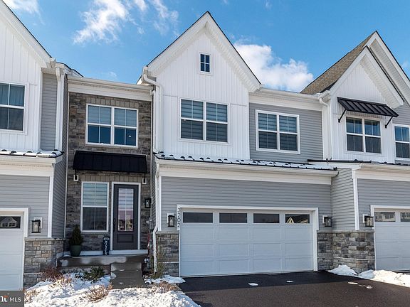 Welcome to this stunning, better-than-new Dalan Model carriage home, ideally situated in the exclusive Reserve at Emerson Farm, a prestigious Toll Brothers community in Warrington Township. Just one year young, this home offers premium upgrades, a thoughtfully designed open-concept layout, luxurious designer finishes, and a neutral palette throughout. A charming stone façade and inviting front porch set the stage for the elegance inside. Step through the front door into a breathtaking two-story foyer, where natural light floods the space, illuminating the gorgeous upgraded light oak hardwood floors that seamlessly flow throughout the main level. Designed for modern living and effortless entertaining, this home boasts a chef-inspired kitchen with TONS of upgrades, featuring abundant white cabinetry with crown molding and gold hardware, quartz countertops, a stylish tile backsplash, an oversized island with Arctic Island Blue cabinetry, a generous walk-in pantry for effortless organization, and higher end stainless steel KitchenAid appliances. The adjacent spacious dining area, enhanced by a new designer chandelier, accommodates even the largest gatherings with ease. The expansive great room showcases a wall of windows with desirable southern exposure, bathing the space in natural light. A mudroom entry from the two-car garage, a convenient powder room, and recessed lighting throughout complete the main level. Step outside through sliding glass doors to the maintenance-free deck, overlooking a newly added full-length paver patio—an ideal setting for summer entertaining and outdoor relaxation. Upstairs, a versatile loft with open rails overlooks the foyer, featuring a grand Palladian window with picturesque views beyond the neighborhood. This flexible space is perfect for a home office, reading nook, or cozy retreat. The luxurious owner’s suite offers a serene escape, complete with a spacious walk-in closet and a spa-inspired en suite bath, featuring a double vanity, seamless glass walk-in shower with built-in ledge, upgraded tile from floor to ceiling, and private water closet. Two additional well-sized bedrooms, each with walk-in closets and recessed lighting, share a beautifully appointed hall bath with a double-sink vanity and tub/shower combination with floor to ceiling tile. An oversized second-floor laundry room with durable vinyl plank flooring and laundry tub adds convenience. The full finished basement provides additional living and entertaining space, complete with an egress window for safety, rough-in plumbing for a future bath, and ample storage. Additional upgrades include WiFi-enabled thermostats, a three-zone HVAC system for energy efficiency, an upgraded WiFi enabled garage door opener, electric blinds for effortless light control, modern one-panel Shaker interior doors with matte black hardware, and sleek eased-edge baseboards throughout for a contemporary finish. This exceptional home blends sophistication, comfort, and functionality in one of Warrington Township’s most desirable communities. Don’t miss this rare opportunity—schedule your private showing today!