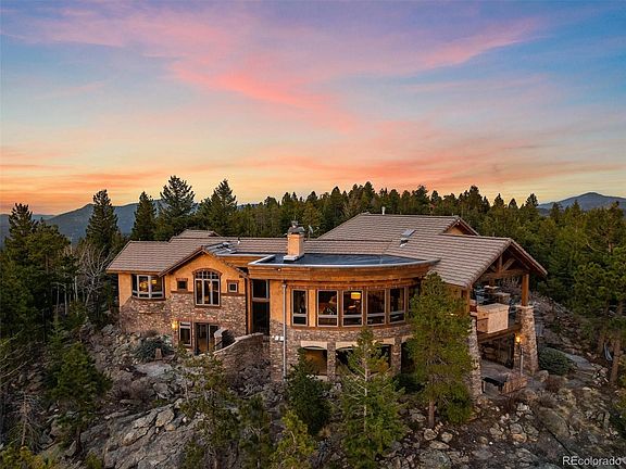 Stunning mountain contemporary on over 44 pristine acres with breathtaking Mt. Evans views. Experience total tranquility and the unsurpassed beauty of the mountains, while being minutes away from downtown Evergreen. The beautifully landscaped grounds and stone walkway lead you to the entry with a wall of windows and spa-like water feature. The quality and designer touches in this home are perfect. The great room boasts walnut hardwood floors, exposed Spanish Cedar ceiling, stone fireplace, wet bar, and a gallery of windows that fill with views. The open gourmet kitchen will delight. Gorgeous granite, knotty alder cabinets, Wolf double ovens, Sub Z, and island. The dining area is perfect for day-to-day living and all special occasions. Even the custom designed laundry room has views! Step out onto the covered deck with gas fireplace and relax. Off the great room is an expansive guest suite with custom murphy beds and private access. The primary suite features more views, vaulted ceilings, impressive walk-in closet and a luxurious bath. The walk-out lower level is just as spacious. High ceilings and walls of windows that fill with views. Two large bedrooms, each featuring its own patio, with one including a wood-burning hot tub. WFH office, work-out room and storage complete the lower level. The 3-car heated garage boasts epoxy floors, high-end work bench, cabinets and EV hook up. On to the amazing 45'x45' RV, Car, Shop & Barn! Spotless! Insulated, in-floor heat. Epoxy floors, 18' RV door, 2 car garage doors, storage loft, plus outside covered 14'x45' area. Endless possibilities for this outbuilding. Other property features include the owned solar panels, Generac whole house generator and the list goes on. Explore your own mountain retreat with beautiful meadows, paths and rock outcroppings with private access to Arapahoe National Forest. The owners have extensively remodeled this home to perfection. All PAVED roads except last 3/10th of a mile is dirt. A Must See!