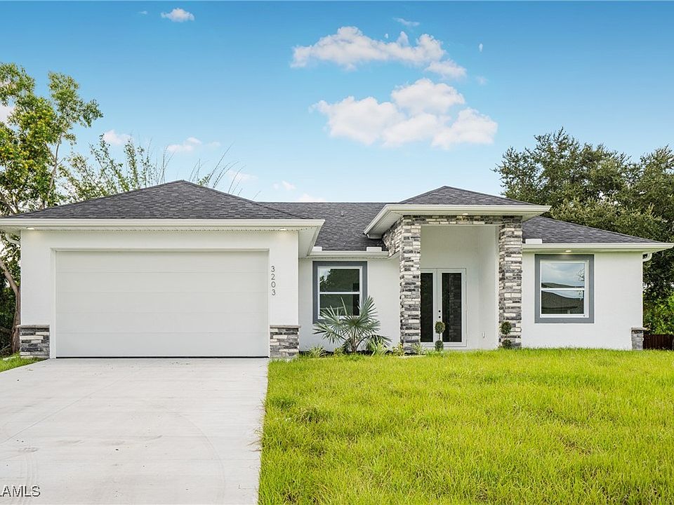 "Welcome to this stunning brand-new construction home located in the heart of Lehigh Acres! This modern, open-concept home offers 3 spacious bedrooms, 2 luxurious bathrooms, and a 2-car garage. The home features high ceilings, elegant porcelain tile flooring throughout, and large windows that fill the space with natural light. The gourmet kitchen boasts quartz countertops, stainless steel appliances, and an oversized island perfect for entertaining. Relax in the spacious master suite, complete with a walk-in closet and a beautifully designed en-suite bathroom with double vanities and a walk-in shower. Step outside to enjoy the serene outdoor space, perfect for relaxing or adding your dream pool. Situated on a quiet street with easy access to shopping, dining, and schools, this home offers the perfect combination of modern living and Florida charm. Don't miss the opportunity to make this brand-new home yours!"