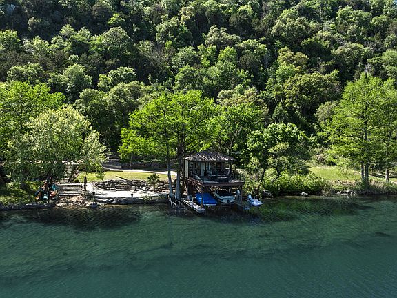 Exuding charm and encompassed by nature, an eclectic residential offering awaits. Proudly gracing the cliffs above the lake with panoramic awe inspiring views of Lake Austin AND Lake Travis, you are nestled into a cozy and luxurious tree house, a life better lived, all at The Brass Buttons Bungalow of Lake Austin! Perched on a hill, this gated waterfront home offers you the coveted lake lifestyle everyone dreams about, with a shared tram down to the fun and adventures lakeside, or a short jaunt by road through the private lakeshore park, the best of both worlds. As you enter the gates of this hidden gem, you are greeted with bespoke details and memorable finishes with floor to ceiling glass windows and doors, flooding the home with natural light. Custom teak floors and solid wood interior doors from Mexico and India offer a curated touch, while an open kitchen featuring granite countertops and stainless steel appliances combine with a wine and coffee bar, all bringing together a truly thoughtful floorplan. Encompassed by nature and nestled within the tree tops, there are three levels of outdoor living spaces, all overlooking the stunning views of the lake, the Texas Hill Country and the impressive Mansfield Dam. You are offered an integrated indoor and outdoor lifestyle, with over 1,000 feet of additional outdoor square footage to enjoy and entertain. Dine al fresco, grill outdoors, sip your coffee above the clouds while watching the magic and adventures of the lake unfold before you. Your ultimate happy hour destination awaits amidst a hot tub, overlooking both Lake Austin AND Lake Travis, a true rarity. The primary bedroom resides at the top level giving you the ultimate in privacy and views, with a private balcony, walk in closet and bathroom detailed with natural stone. Apache shores is a hidden gem on its own, a pocket of nature and tranquility, yet moments to the conveniences you need, offering a community pool, a sport court, a hiking trail, a disk golf course, and a gated lakeside park with swimming beach, BBQ, picnic tables, playscape, and boat slip. The esteemed Lake Travis ISD offers academic excellence, and an impressively low tax rate is in place. Already income producing as a short term rental, this waterfront escape could be a second home, an outstanding investment or a place to call home. Enjoy all that lake living has to offer, nature, serenity, amenities AND a boat slip. This the Brass Buttons Bungalow of Lake Austin!