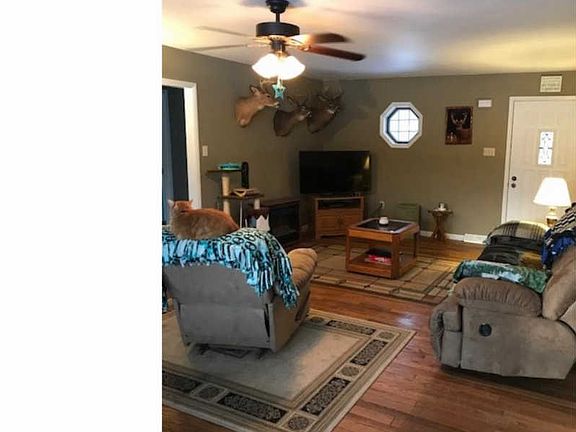 Really Nice unique one story home with open floor plan and good room sizes. Great room with wood floors and floor to ceiling raised hearth brick wood burning fireplace and French doors out to new deck and secluded one acre property. New kitchen with black appliances, Pantry, breakfast room and huge picture windows overlooking scenic property. Laundry/mudroom room with new washer and dryer and access to oversized 2 car attached garage with automatic door opener. Master Bedroom with plenty of closet space and spacious En-suite. Two additional bedrooms with hall bath on opposite side of house. Awesome daylight unfinished basement with high ceilings and proper egress windows ready for finishing if so desired. Large storage shed, all new flooring and lighting fixtures new high energy efficient heating system and freshly painted throughout make this a home worth considering.