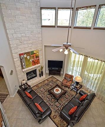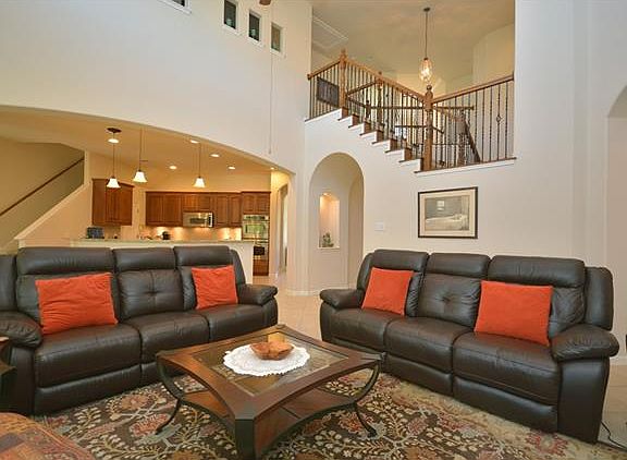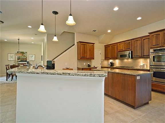 Big and tall! Great flex floor plan - Large 5 beds plus gameroom, office with french doors, master down, guest bedroom w/private bath down, formal living or dining option, 2 built-in desk areas, 2 staircases, 10 ft+ ceiling, breakfast can accommodate large table, 20ft gas fireplace, art niches, archways, large secondary bedrooms w/ bath. Kitchen features huge island, granite counters, butler's pantry, walk-in pantry, SS double ovens, microwave. Master has double walk-in shower & granite. Beautiful landscaping, covered stone patio, extra parking pad, 3 car garage - a perfect home for a growing family. Recent updates includes master closet, AC unit and water heater. Includes water softener and full irrigation system.
