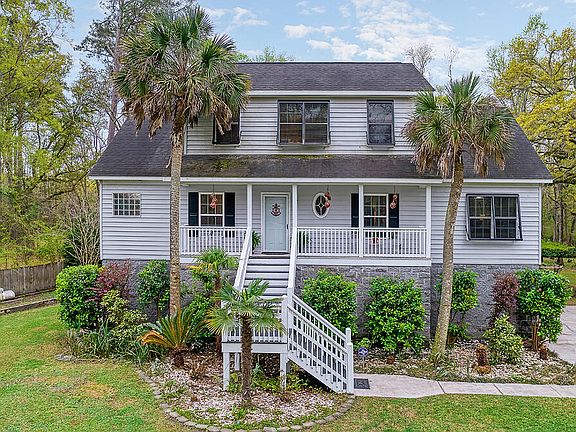 This beautiful elevated home is nestled on an idyllic 3.68-acre wooded lot on a tidal creek. The property is gated, for added privacy, and includes a remote control gate. The home is elevated 11 feet with a large two-car garage underneath, which has a full kitchen and also offers plenty of space for parking and storage. Outside, you'll find Bahama shutters on the windows. The home also features a whole-home generator. A front porch welcomes you home and is a great place for your rocking chairs. As you enter, you're greeted by luxury vinyl plank flooring, smooth ceilings, crown molding, and a spacious open floor plan with a great flow for entertaining and everyday living. The formal dining room will be perfect for dinners with family and friends.Enjoy cool evenings in front of the cozy gas three-sided fireplace located between the family room and the dining room. The kitchen boasts recessed lighting, stainless steel appliances, a breakfast bar, ample cabinet and counter space, and a pantry for additional storage space. Located off of the kitchen and family room is a flex room, which could be used as sitting/keeping room, a breakfast room, or a home office. The spacious first-floor master bedroom features a walk-in closet and a private en suite bathroom with a dual vanity, a luxurious deep-soaking tub, and a separate shower. The rest of the bedrooms are located upstairs. The two upstairs bonus rooms could be used as 4th and 5th bedrooms or would also make an excellent game room, entertainment room, children's playroom, or home office/study. Completing the second floor is a nice open loft area. The screened-in porch, open deck, two covered patios (one with a charming pergola), and huge private backyard create an idyllic setting which will be perfect for grilling out, entertaining, watching the kids play, or just relaxing after a long day. The backyard is partially wooded with mature trees and native Saw palmettos. You'll also have your own small dock on the tidal creek, which is a great place to canoe or kayak. You'll enjoy the peacefulness of country living, while still being conveniently located just a short drive from shopping, dining, Downtown Charleston, and area beaches. Come see your new home, today!