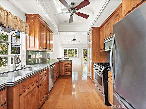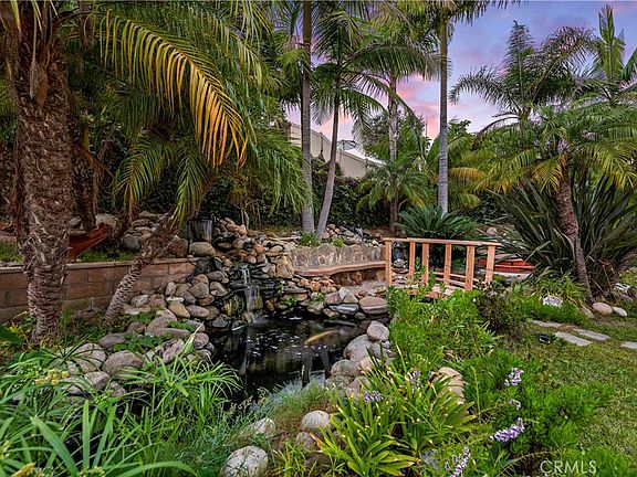 Welcome to this lovely Sun Ranch Single Level Home. This home has Three bedrooms and a den (currently used as a formal dining room, easily could be a 4th bedroom or office). The living room looks out onto your private Tropical Paradise with lush landscaping including palm trees, a 40Ft Koi Pond with gorgeous Koi fish and 2 waterfalls. There is a retractable awning feature over the patio. Kitchen features custom cabinets with pantry and pull out shelves, pecan engineered wood floors, raised ceiling with crown molding and ceiling fans. Granite counters, stainless appliances and garden window. Dual Pane Vinyl Windows and sliders throughout the home. The Two Bathrooms feature travertine tile flooring, custom cabinets, built-ins, deep tub in secondary bathroom. Master Bathroom has an oversized shower with glass enclosure with floor to ceiling travertine. Skylights added for natural lighting. There are ceiling fans throughout. Three Car Garage w/epoxy floors and built-in cabinets. There is an added upstairs workout room/loft over the garage. There is also a huge Attic conversion with tons of storage. The attic could be built out as a room without changing roof line. Solar Panels owned. Just 2 miles to beach and harbor. NO HOA and NO Mello-Roos.